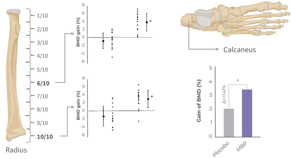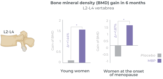 Several clinical studies are supporting the benefits of MBP® on bone mineral density support. Double-blind, randomized, and placebo-controlled, these studies are designed to study different populations of women of all ages from younger age to post-menopause.
