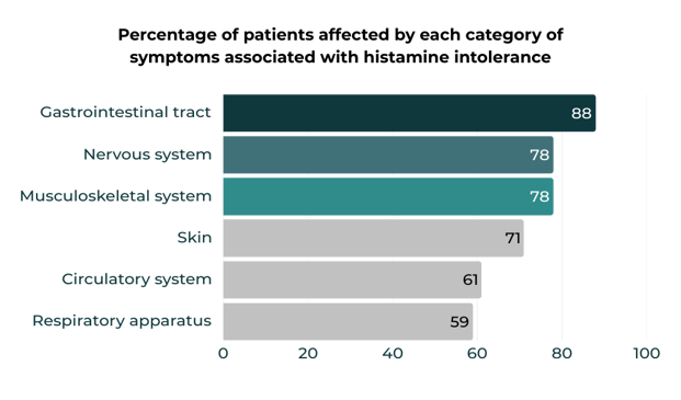 Gastrointestinal, nervous system, and musculoskeletal issues are among the most common. Headache, bloating, and fatigue affect more than 60% of people, while pruritus, flushing, rhinitis, muscle pain, constipation, and low blood pressure are also frequent. On average, individuals experience eight different symptoms, and 99% had three or more at the same time, making histamine intolerance a challenge that affects overall quality of life.