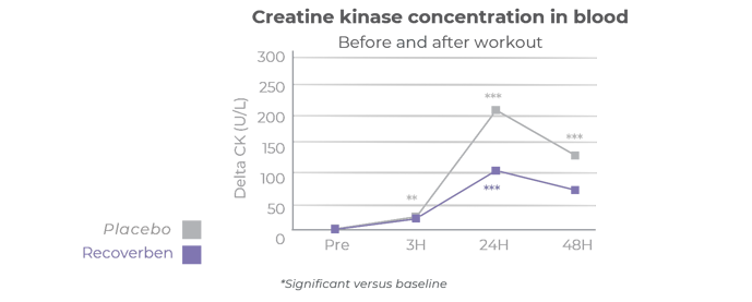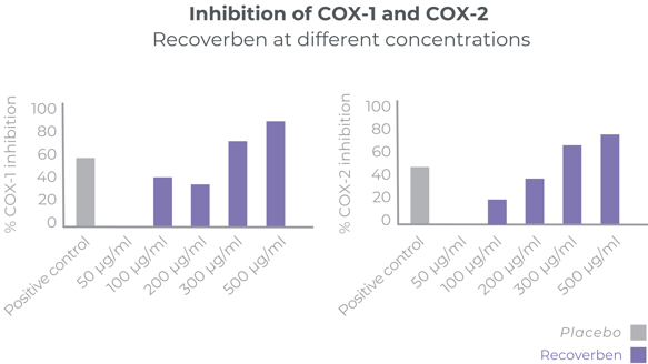 Recoverben® supports muscle strength and a faster recovery after exercise. Its mechanism of action reducing inflammation via inhibition of cyclooxygenases has been demonstrated in an in-vitro study. A clinical study demonstrated its benefits on 37 subjects.