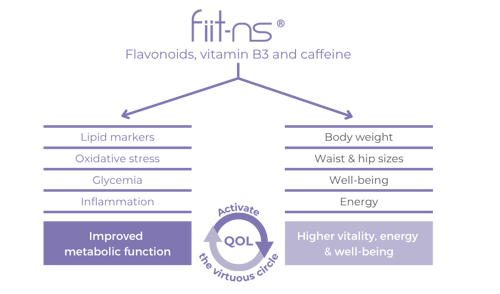 Fiit-ns® is a clinically supported ingredient designed to improve metabolic function and activate a virtuous circle of wellbeing. Its unique blend combines polyphenols from grape, grapefruit, green tea, black carrot, and guarana with vitamin B3 and low-dose caffeine.