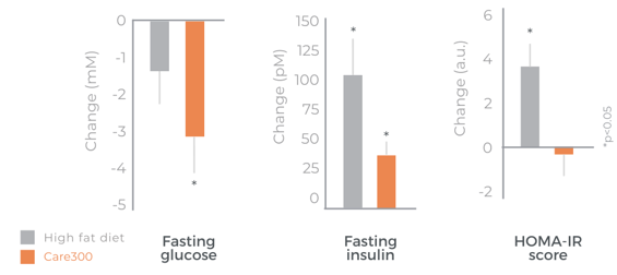 Care300® improves glucose management. Its mechanism of action in SIRT1 and AMPK modulation has been analysed in in-vitro studies. Its benefits have been confirmed in a chronic gold-standard clinical study.