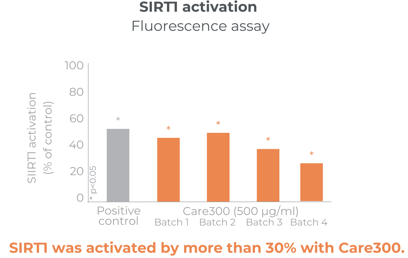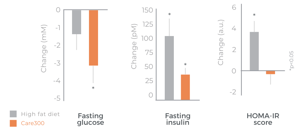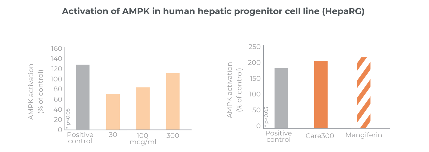 Care300® improves glucose management. Its mechanism of action in SIRT1 and AMPK modulation has been analysed in in-vitro studies. Its benefits have been confirmed in a chronic gold-standard clinical study.